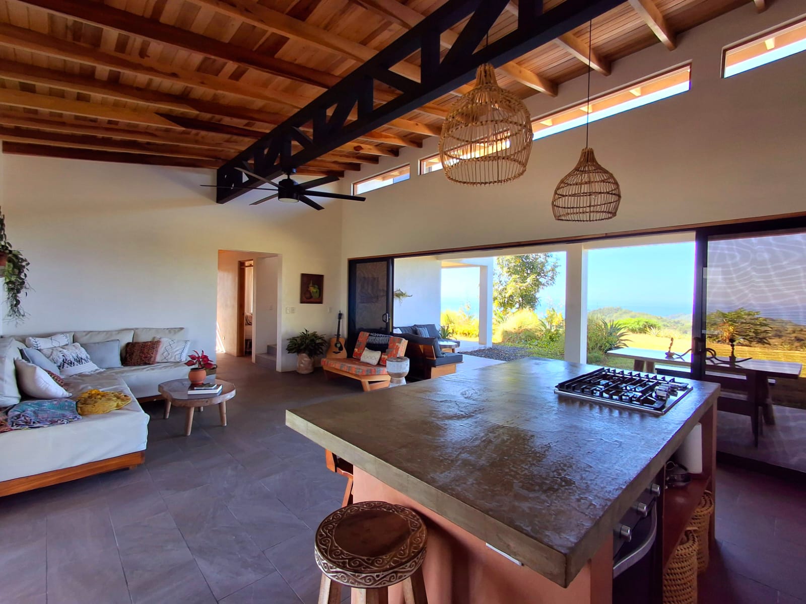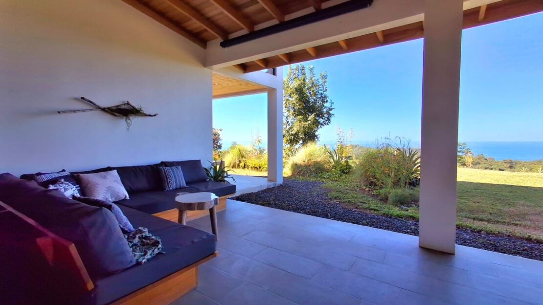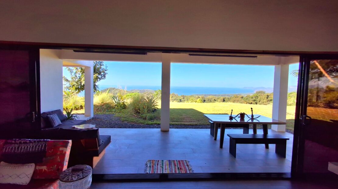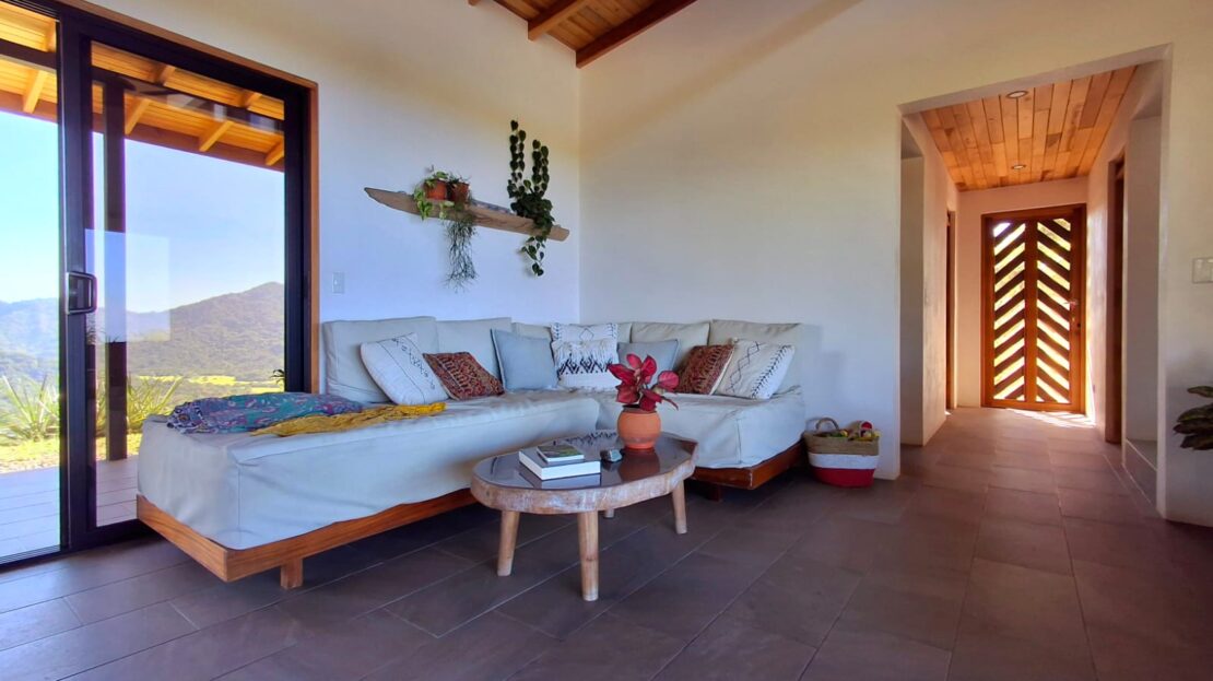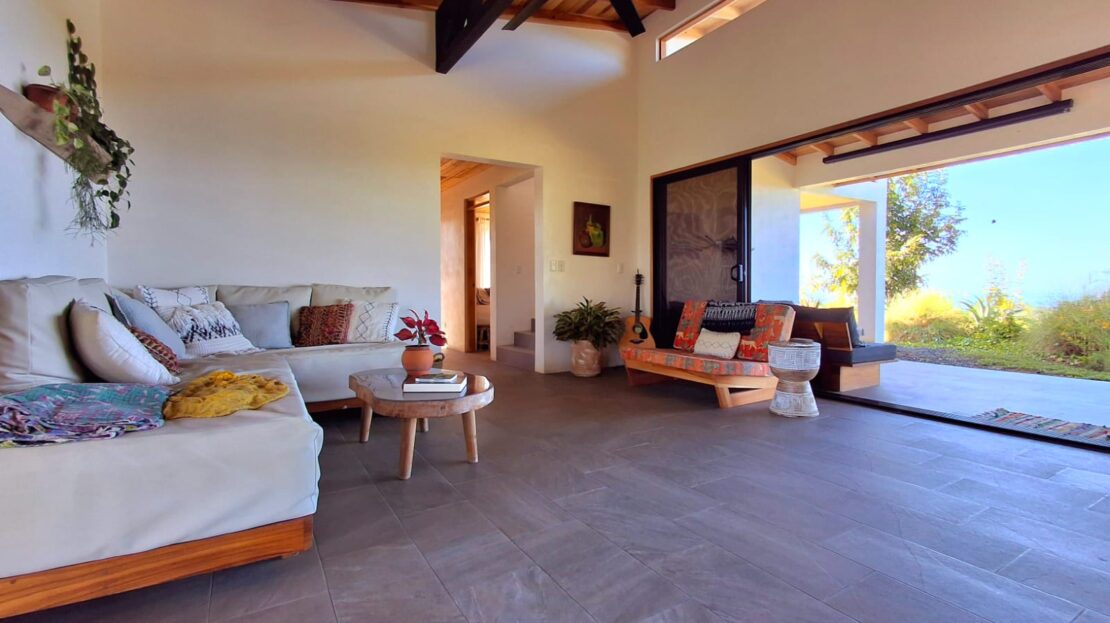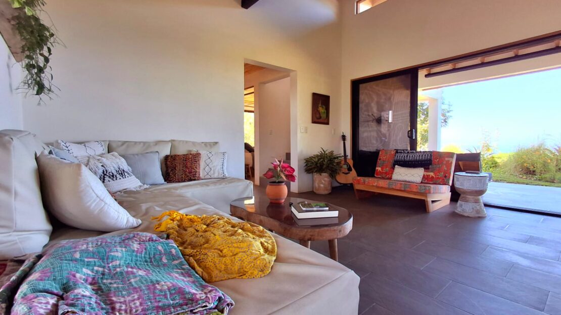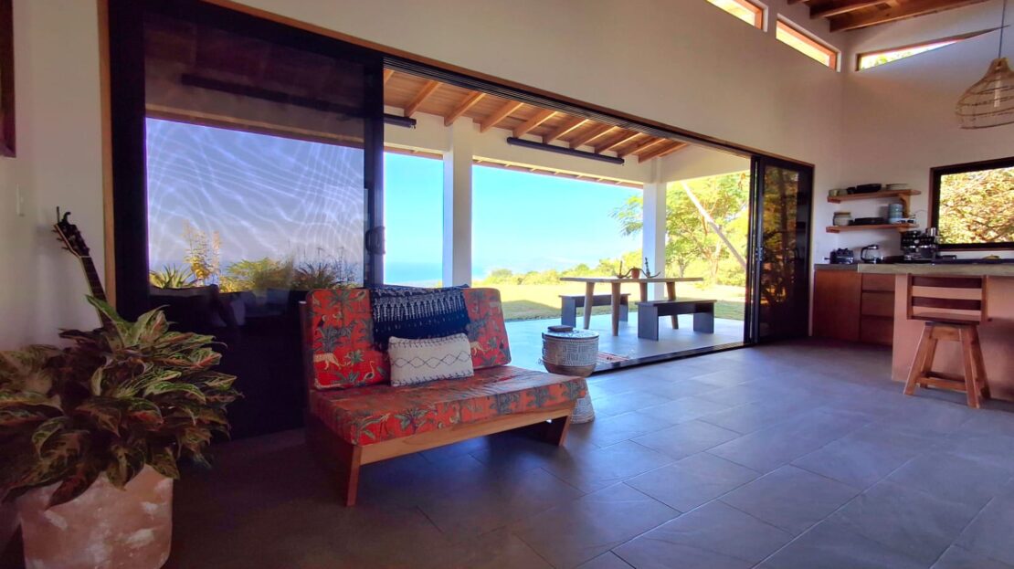 Set on top of a hill, the home enjoys uninterrupted 360-degree views. Sunrise and sunset, mountains, jungle, valley, and ocean—every direction offers something special. Thanks to its elevated position, a refreshing breeze flows through the house most of the time, enhanced by the open-concept design and large windows on both sides: mountains behind and wide-open ocean views in front.