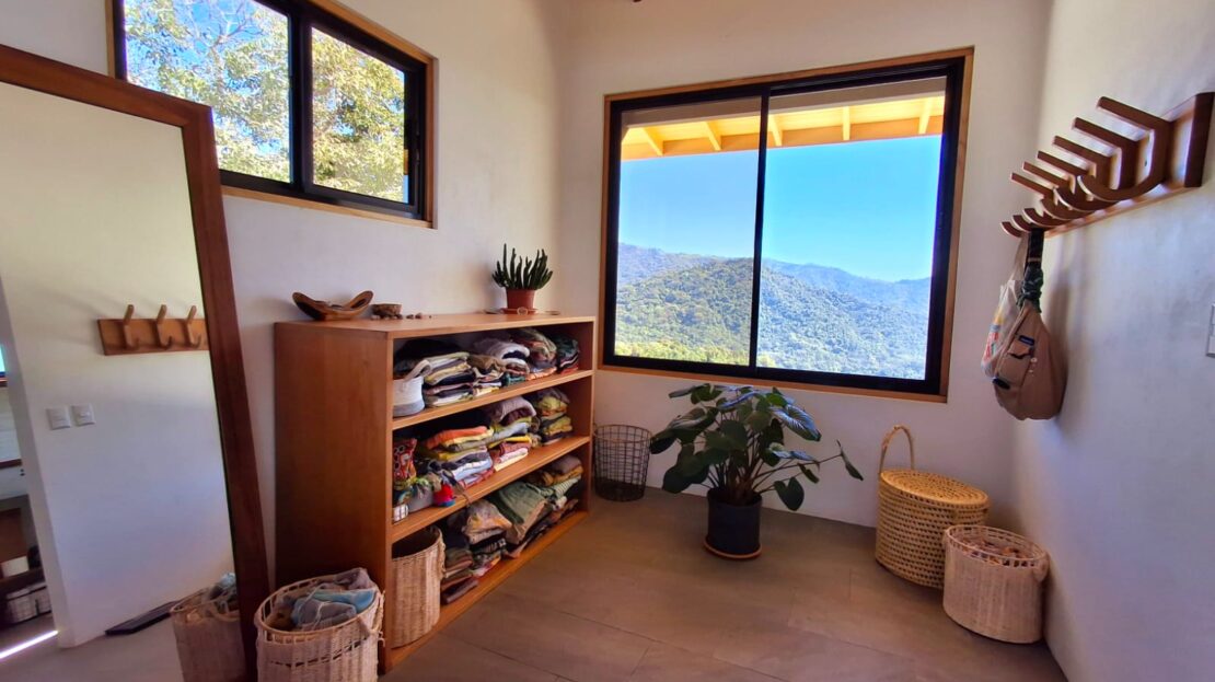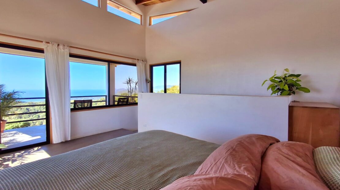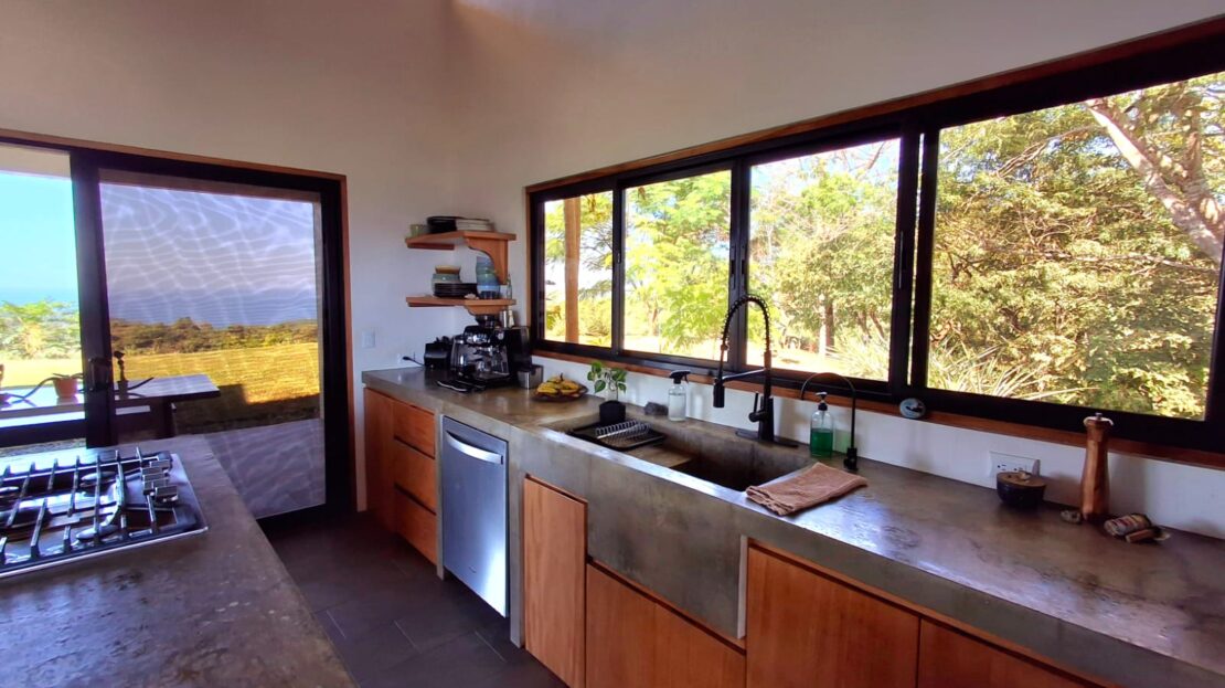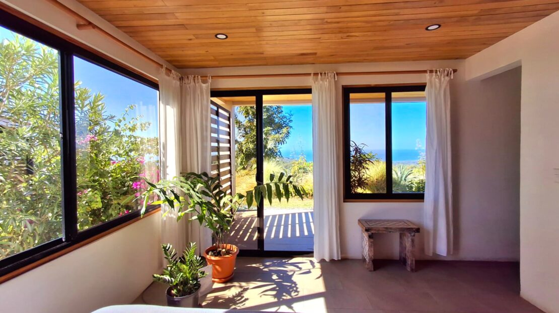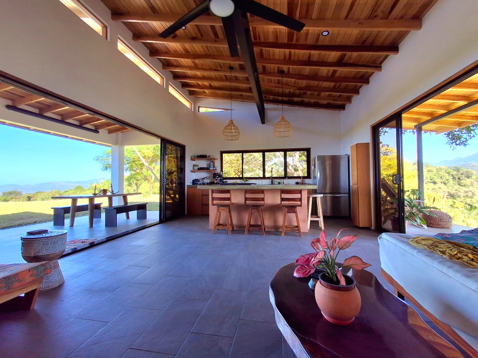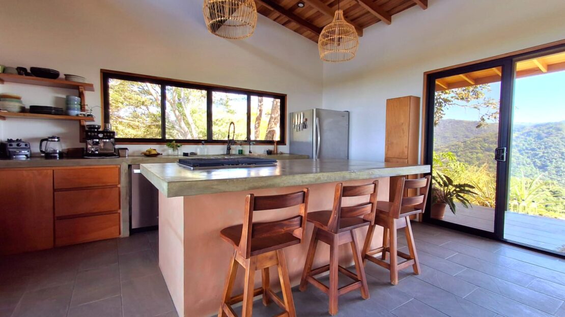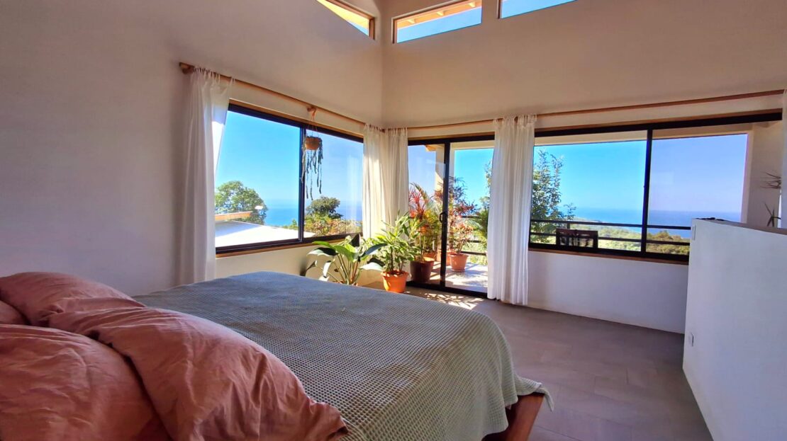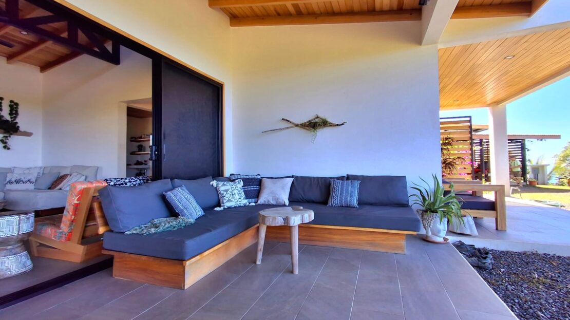 Set on top of a hill, the home enjoys uninterrupted 360-degree views. Sunrise and sunset, mountains, jungle, valley, and ocean—every direction offers something special. Thanks to its elevated position, a refreshing breeze flows through the house most of the time, enhanced by the open-concept design and large windows on both sides: mountains behind and wide-open ocean views in front.