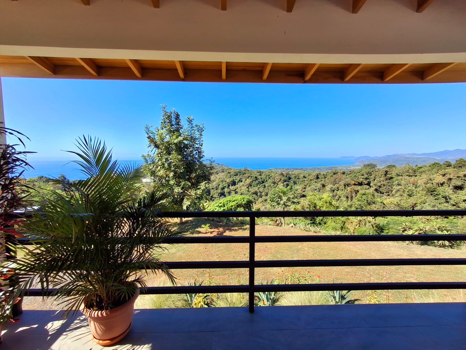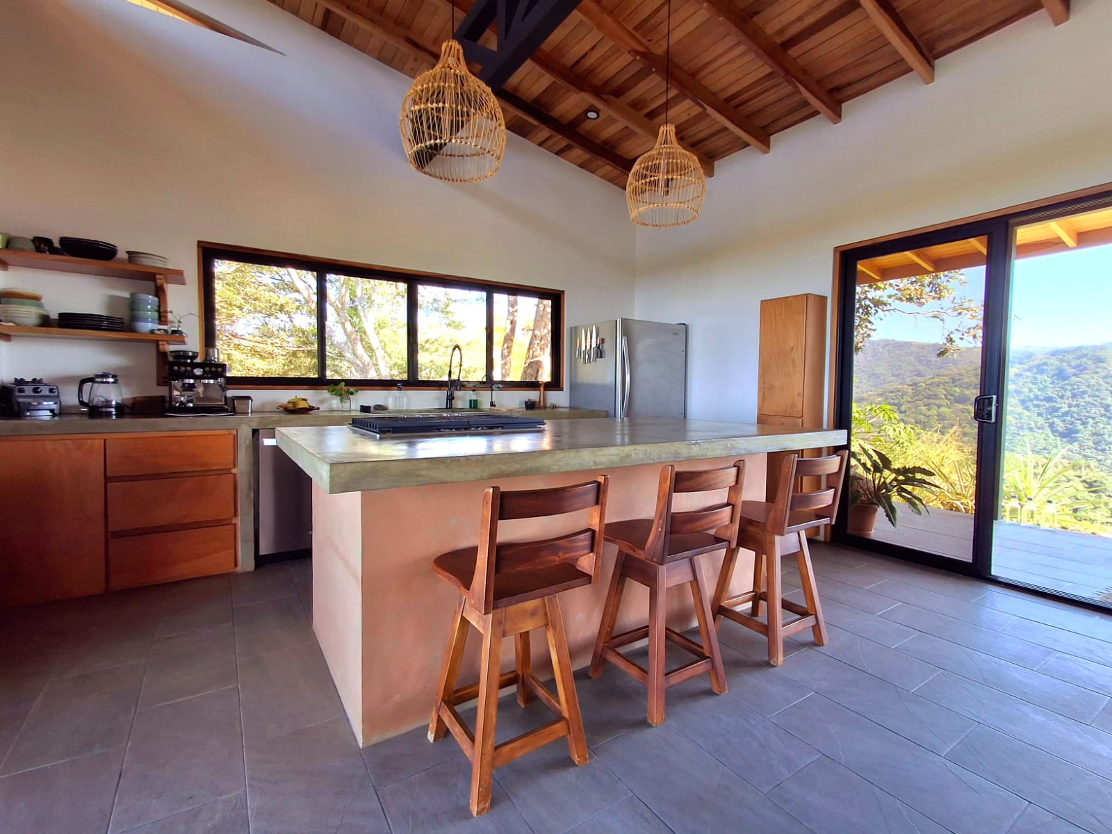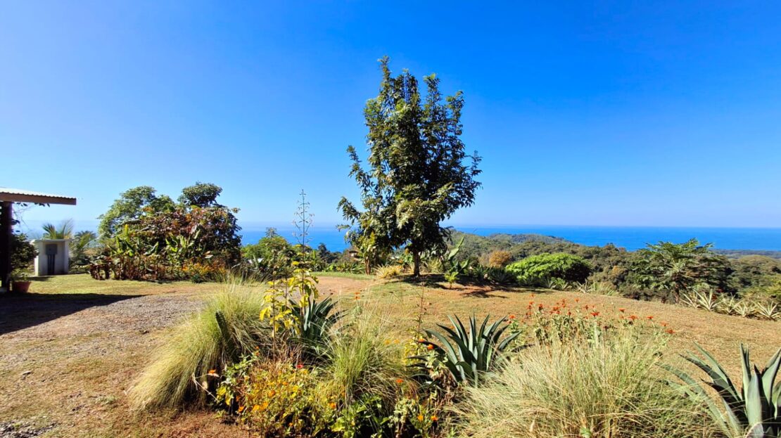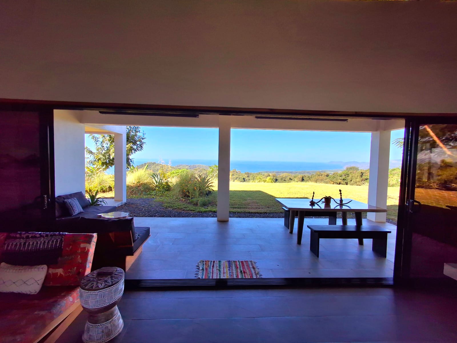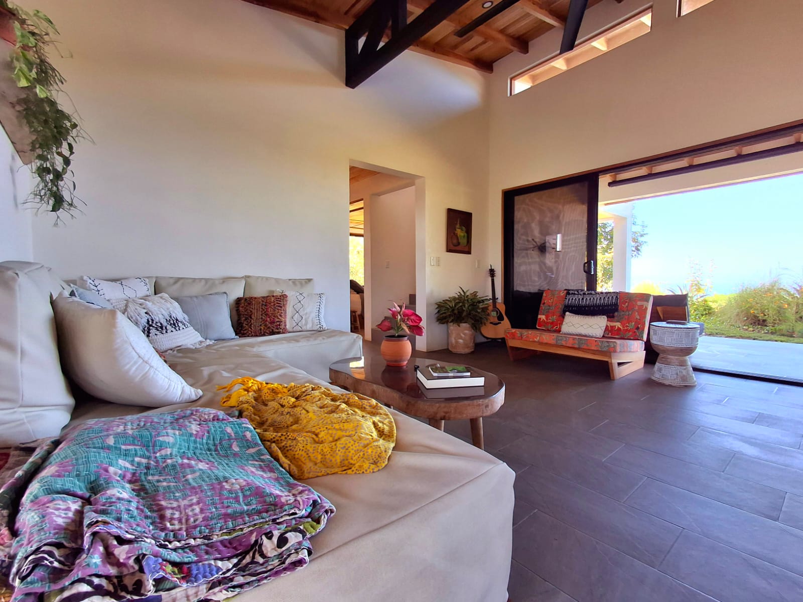 Set on top of a hill, the home enjoys uninterrupted 360-degree views. Sunrise and sunset, mountains, jungle, valley, and ocean—every direction offers something special. Thanks to its elevated position, a refreshing breeze flows through the house most of the time, enhanced by the open-concept design and large windows on both sides: mountains behind and wide-open ocean views in front.