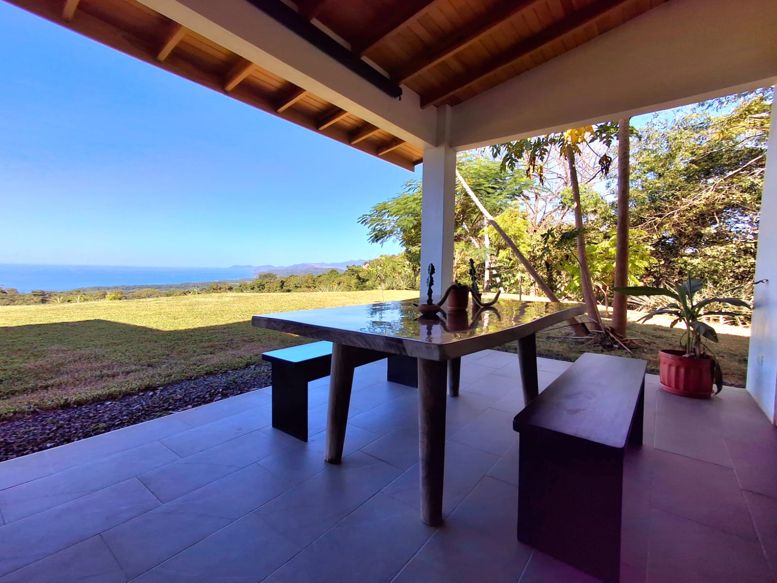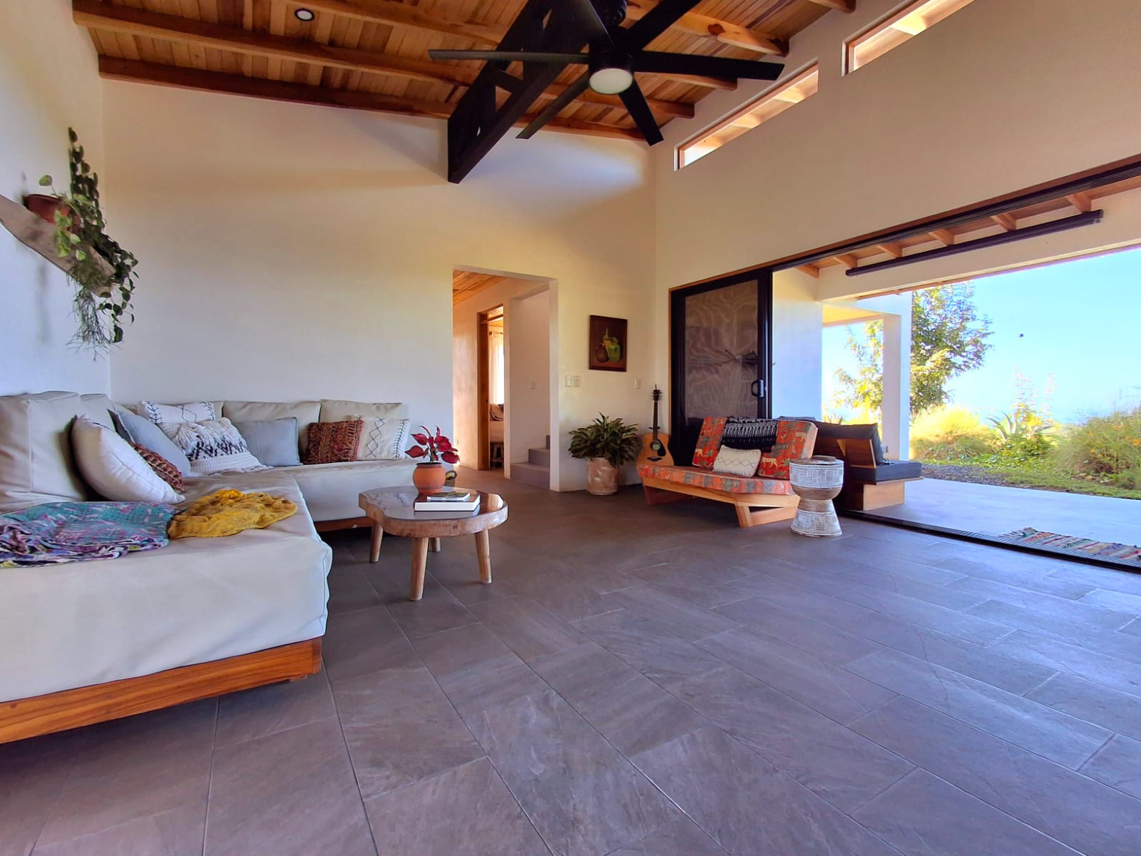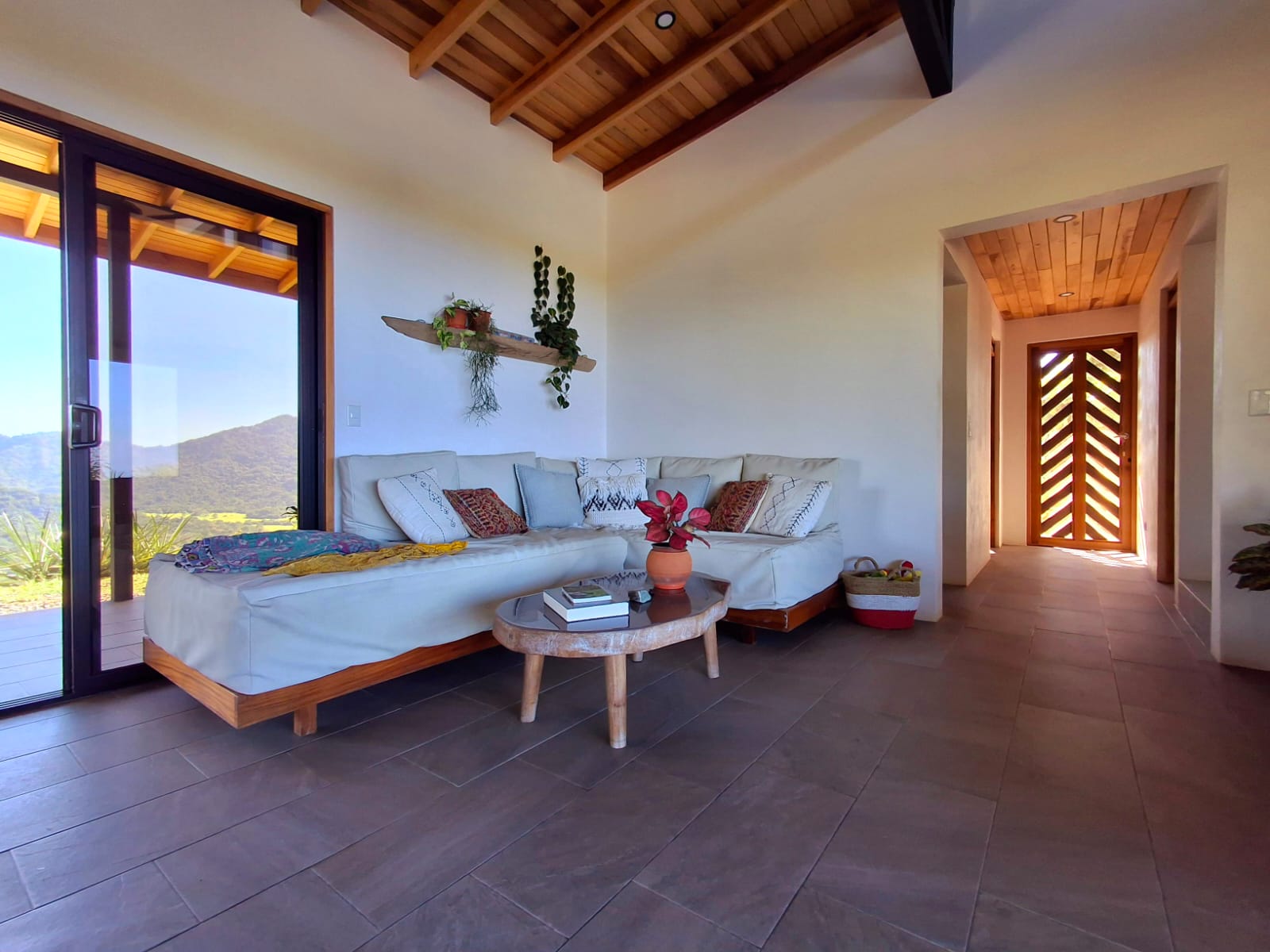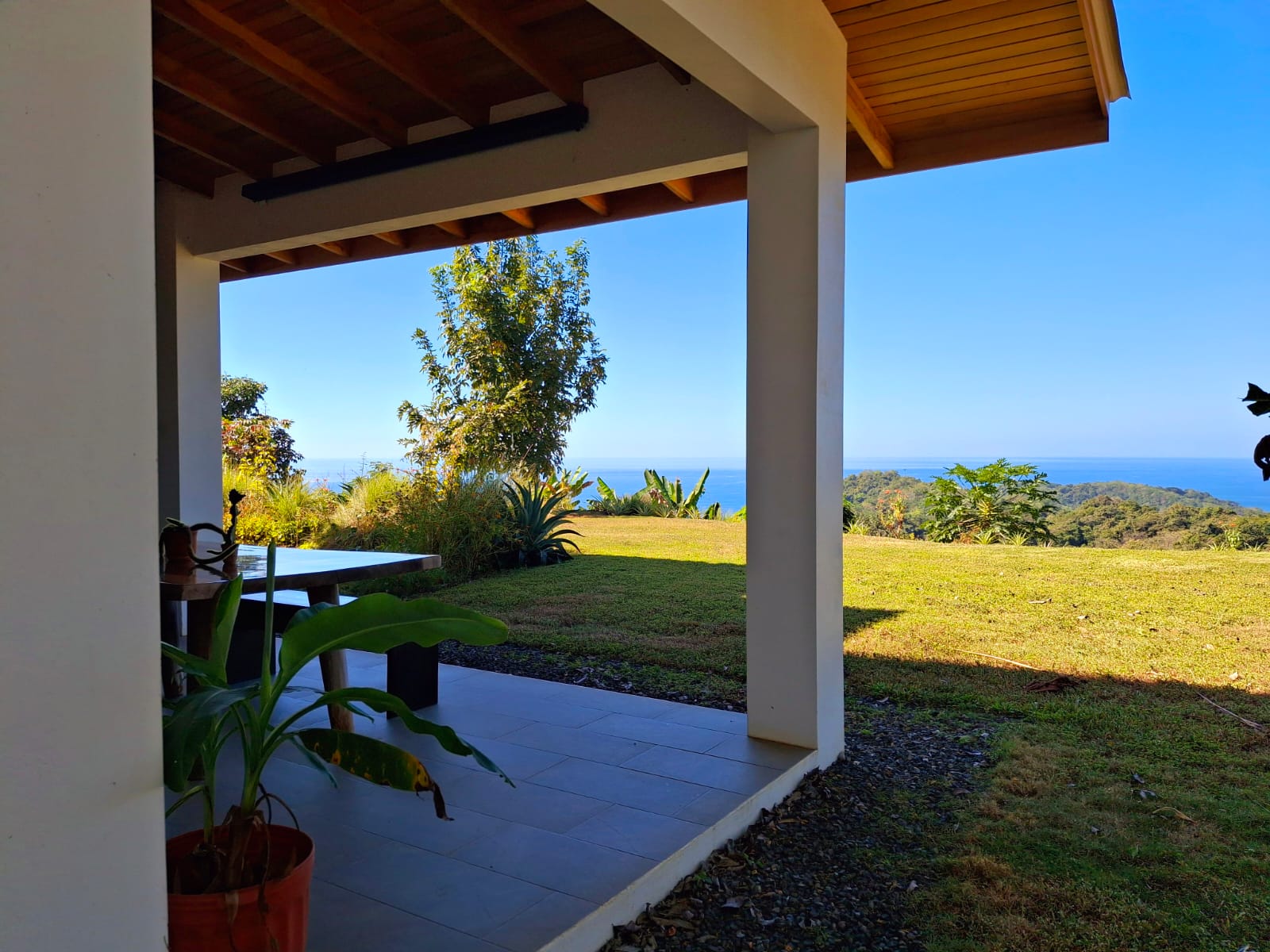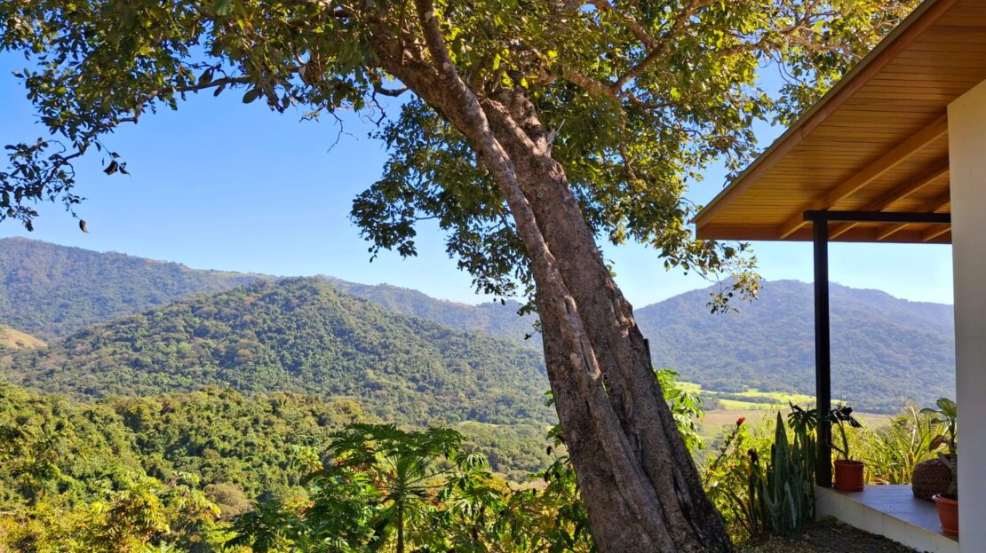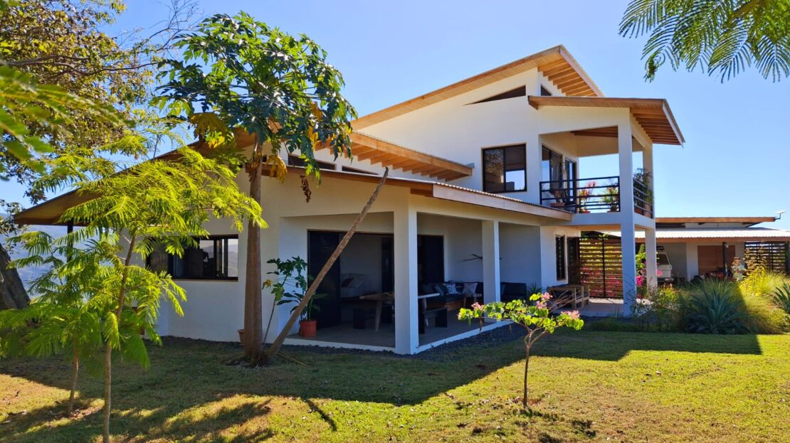 Set on top of a hill, the home enjoys uninterrupted 360-degree views. Sunrise and sunset, mountains, jungle, valley, and ocean—every direction offers something special. Thanks to its elevated position, a refreshing breeze flows through the house most of the time, enhanced by the open-concept design and large windows on both sides: mountains behind and wide-open ocean views in front.