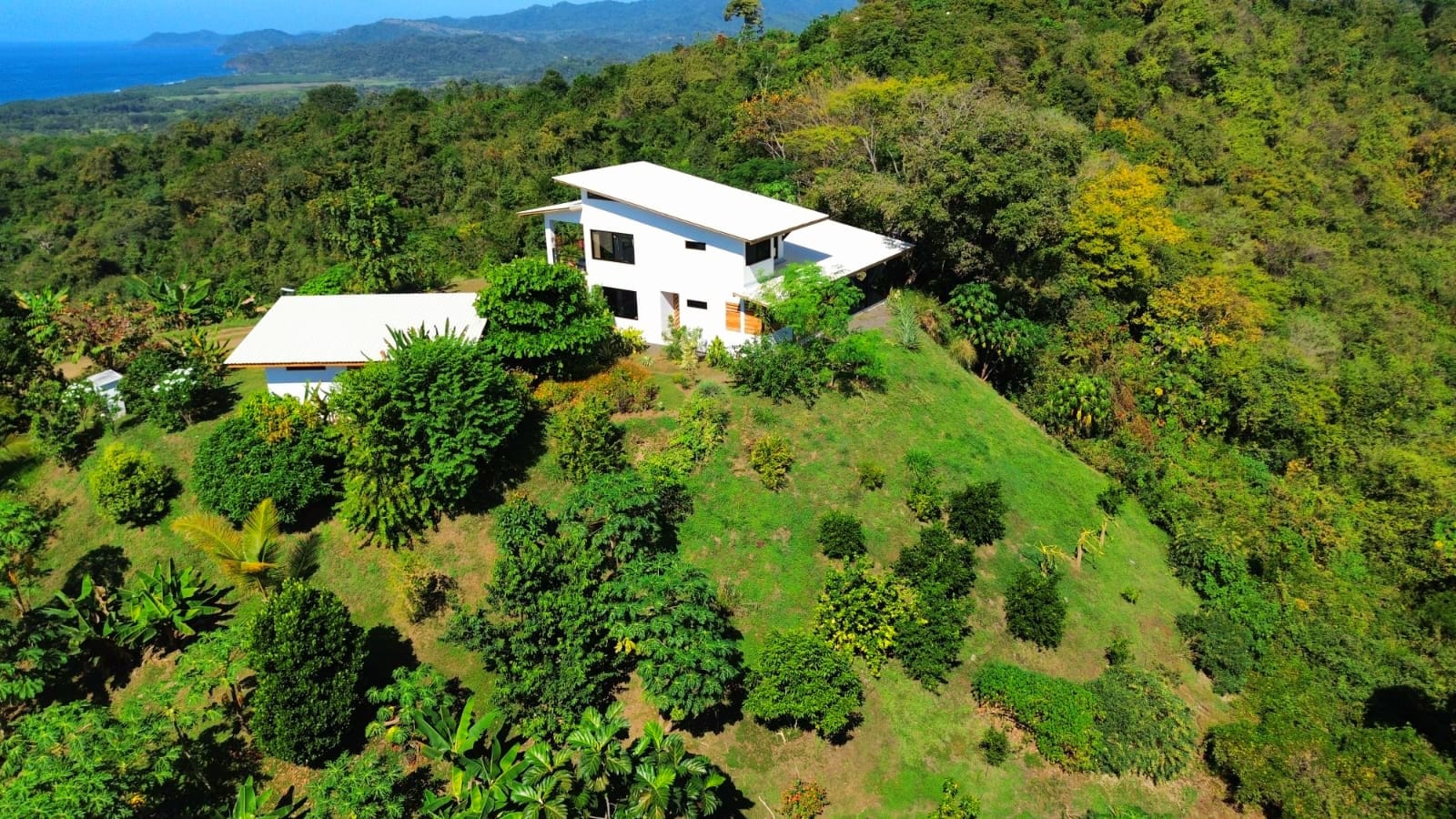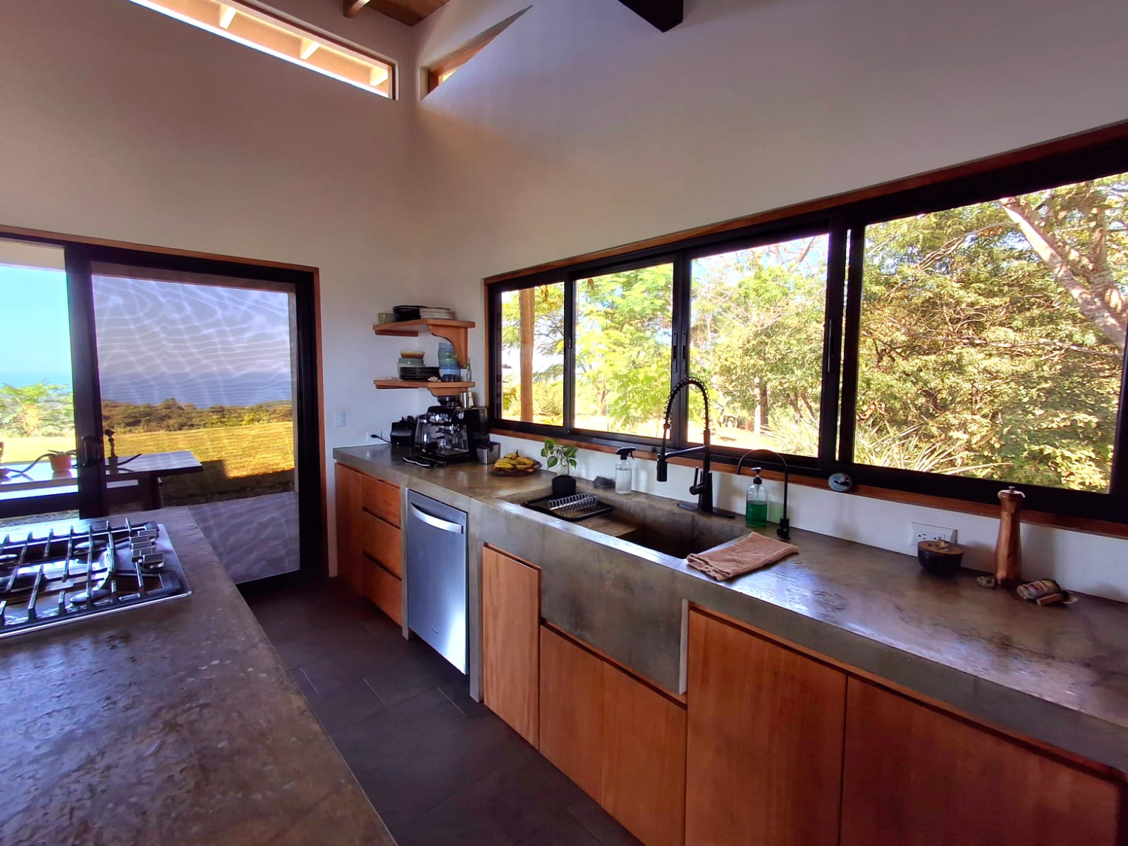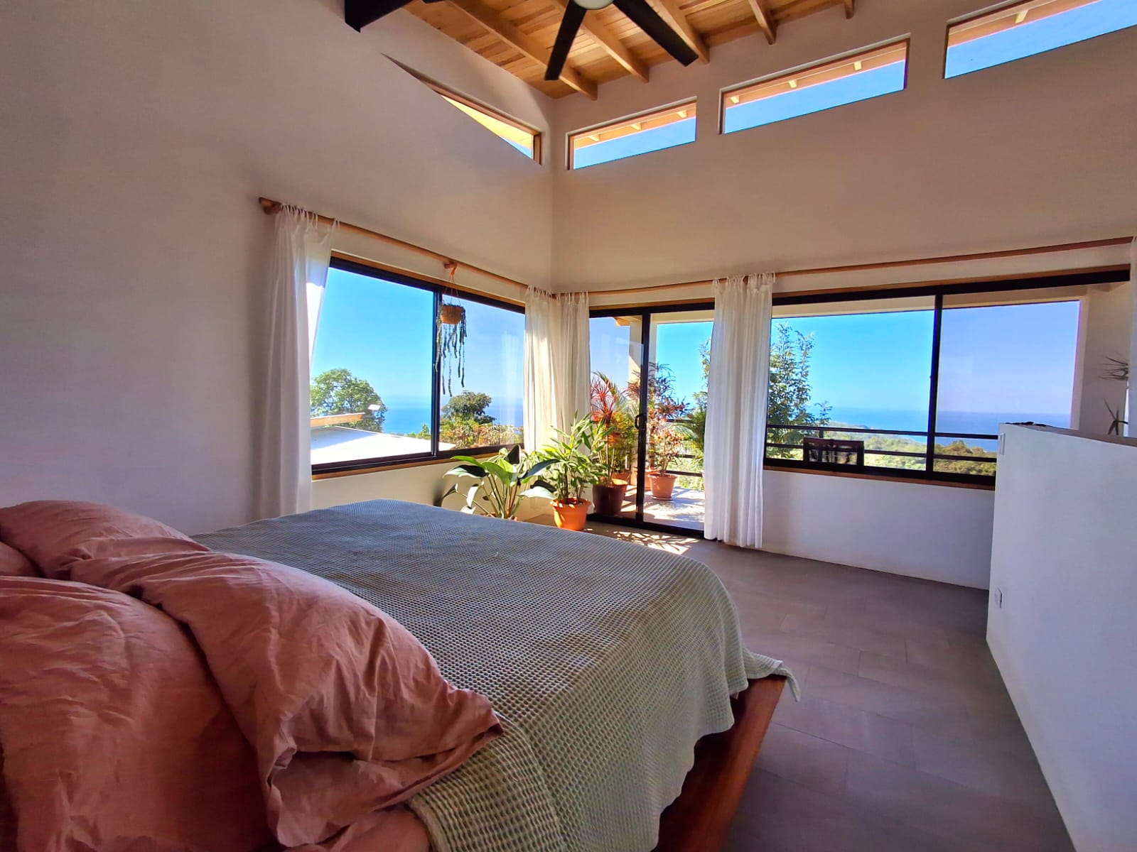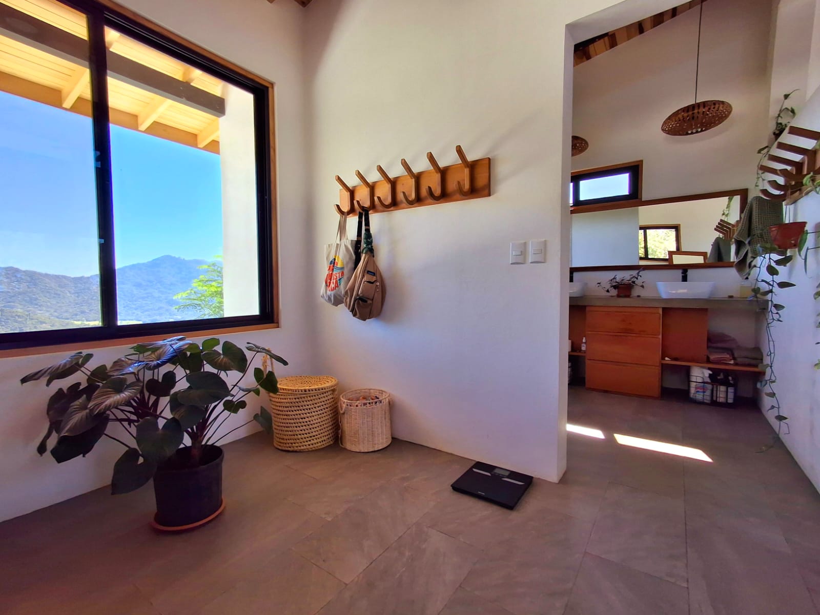 Set on top of a hill, the home enjoys uninterrupted 360-degree views. Sunrise and sunset, mountains, jungle, valley, and ocean—every direction offers something special. Thanks to its elevated position, a refreshing breeze flows through the house most of the time, enhanced by the open-concept design and large windows on both sides: mountains behind and wide-open ocean views in front.