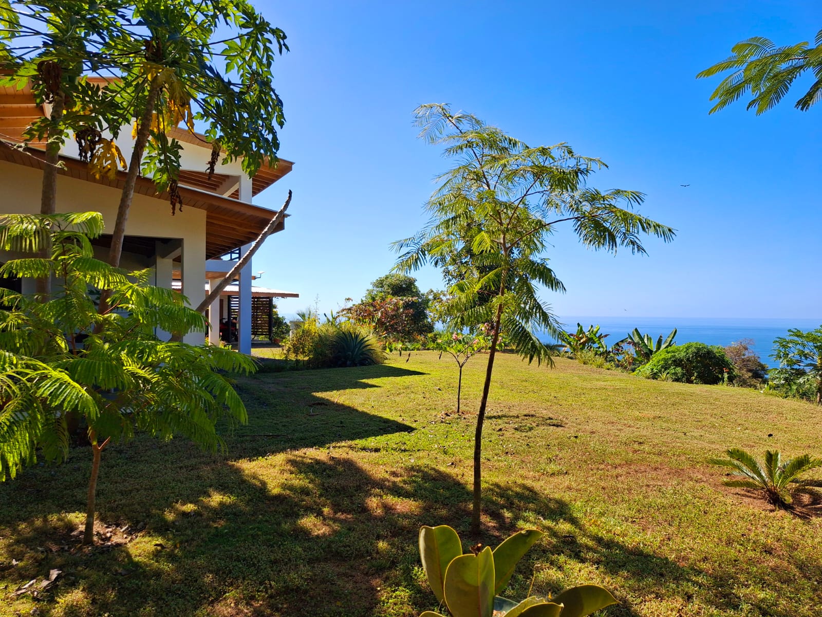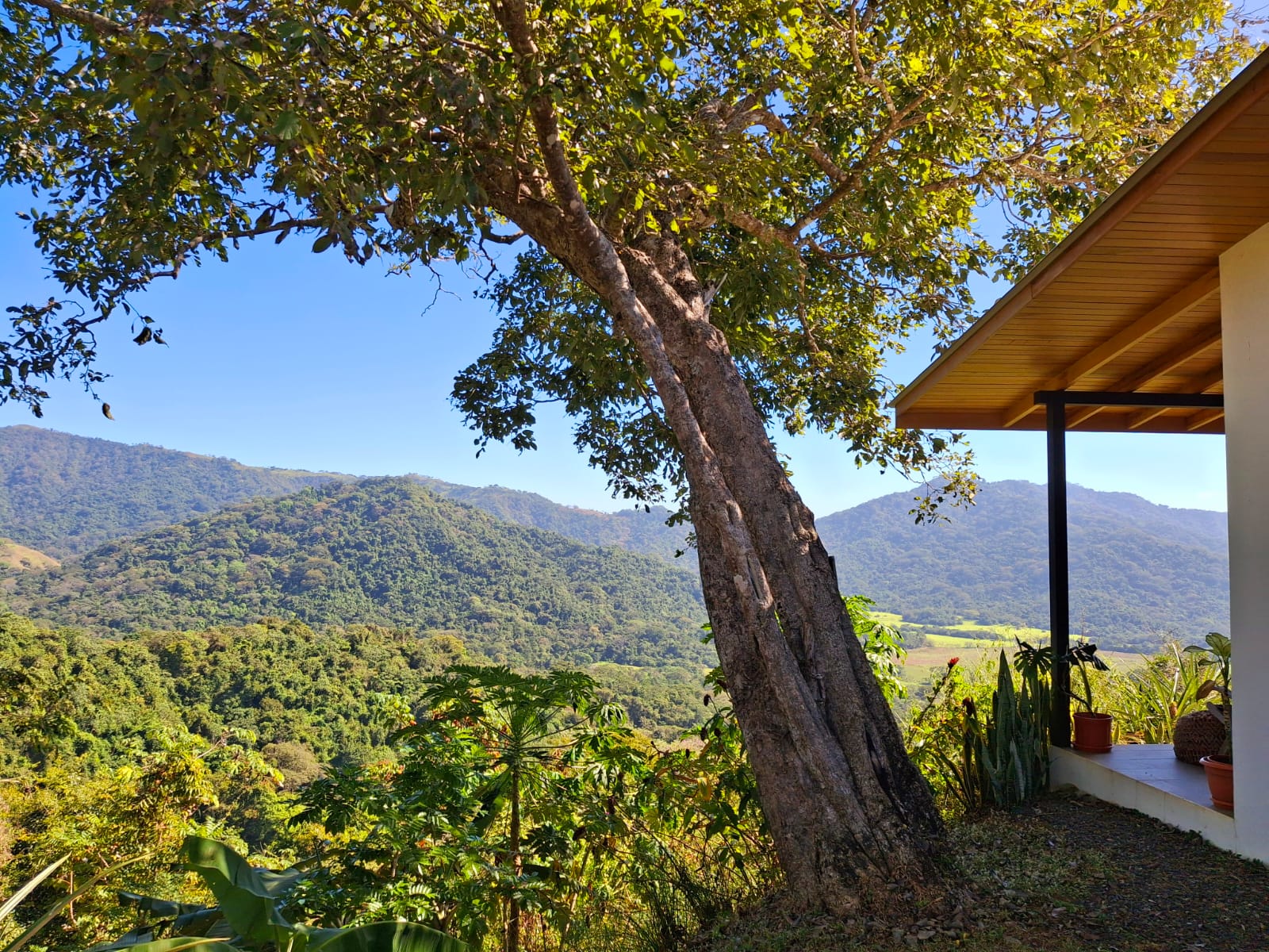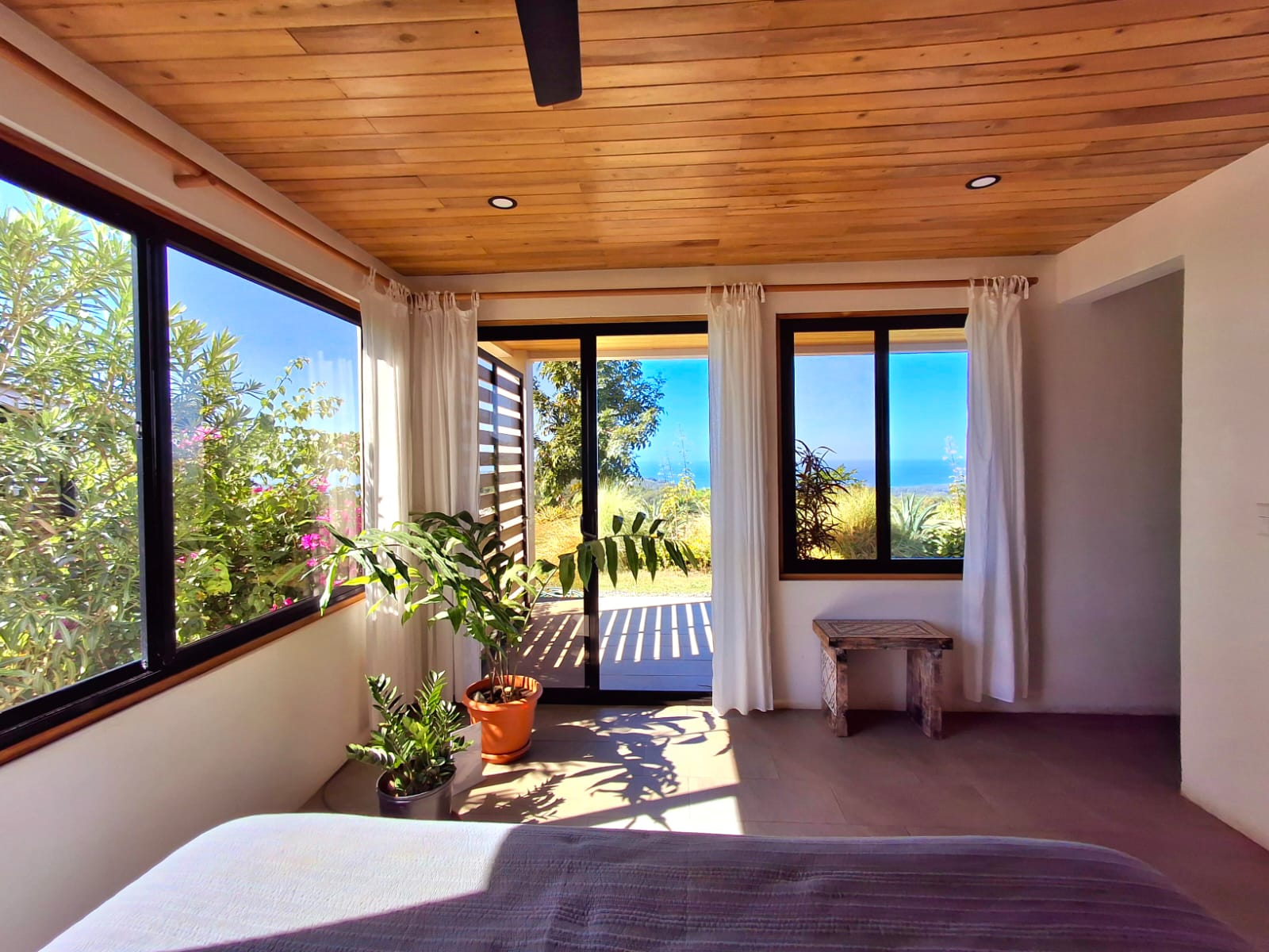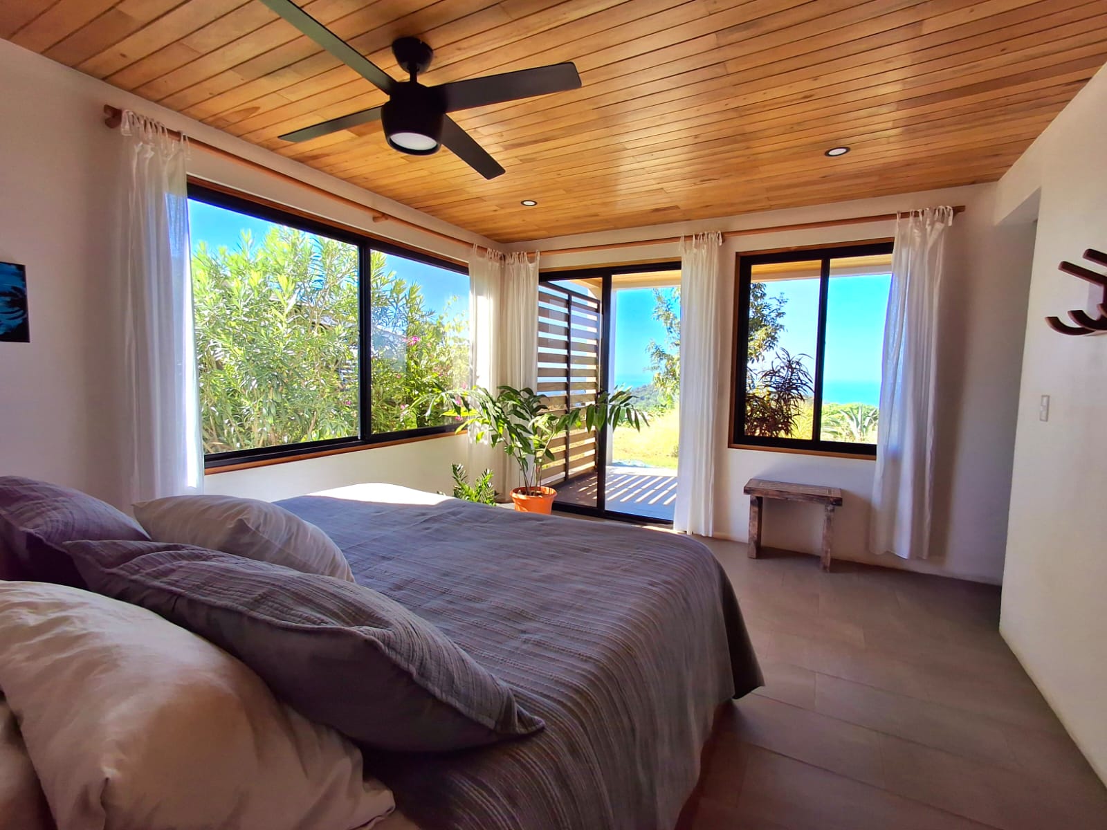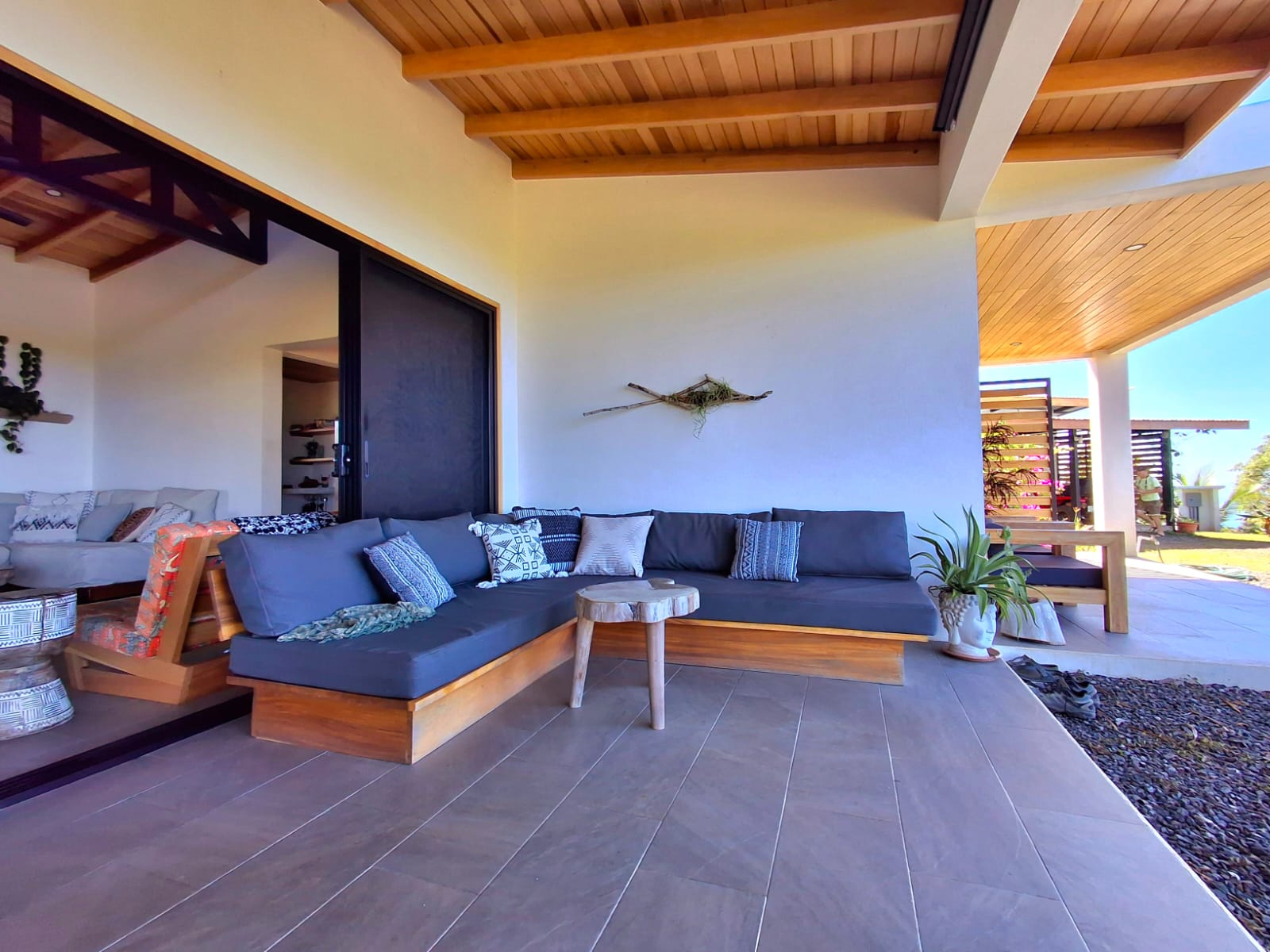 Set on top of a hill, the home enjoys uninterrupted 360-degree views. Sunrise and sunset, mountains, jungle, valley, and ocean—every direction offers something special. Thanks to its elevated position, a refreshing breeze flows through the house most of the time, enhanced by the open-concept design and large windows on both sides: mountains behind and wide-open ocean views in front.
