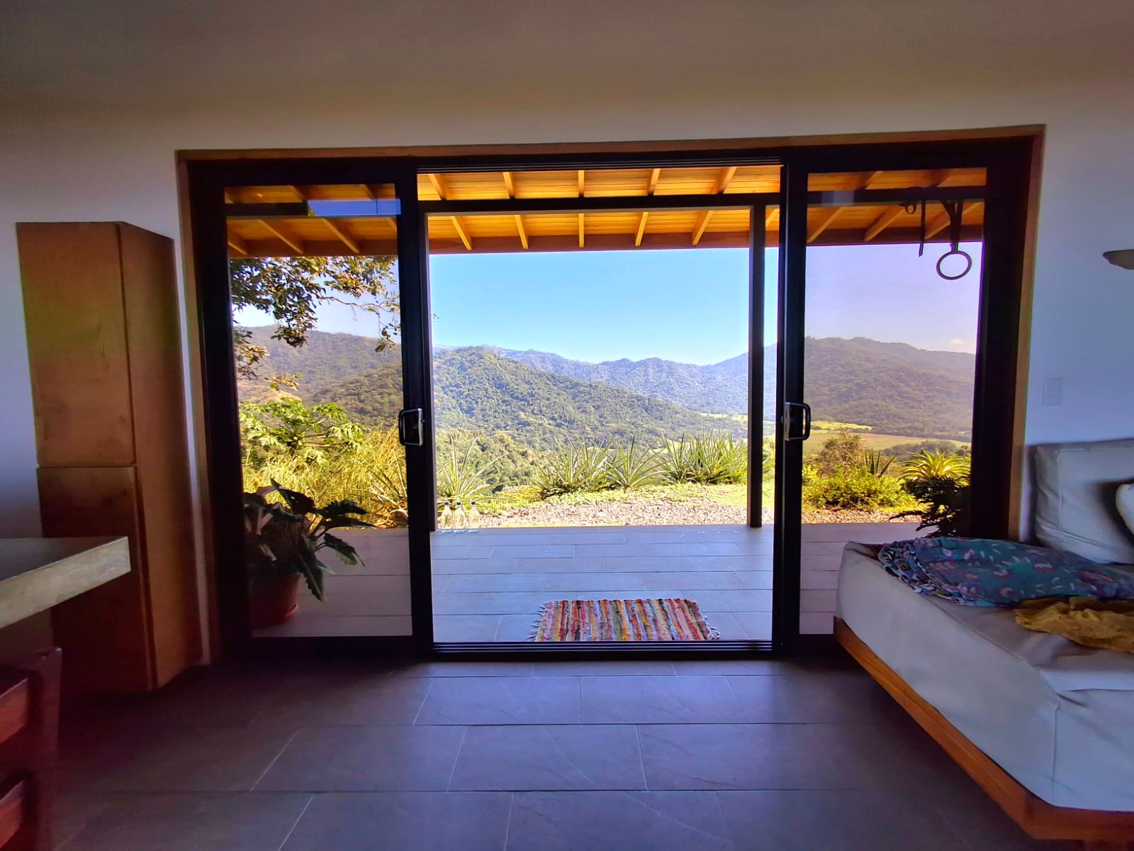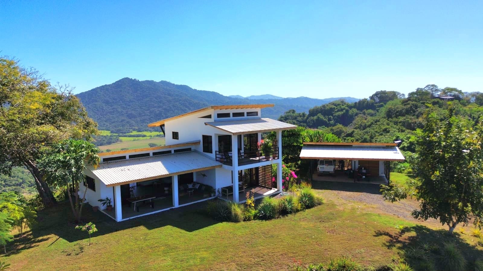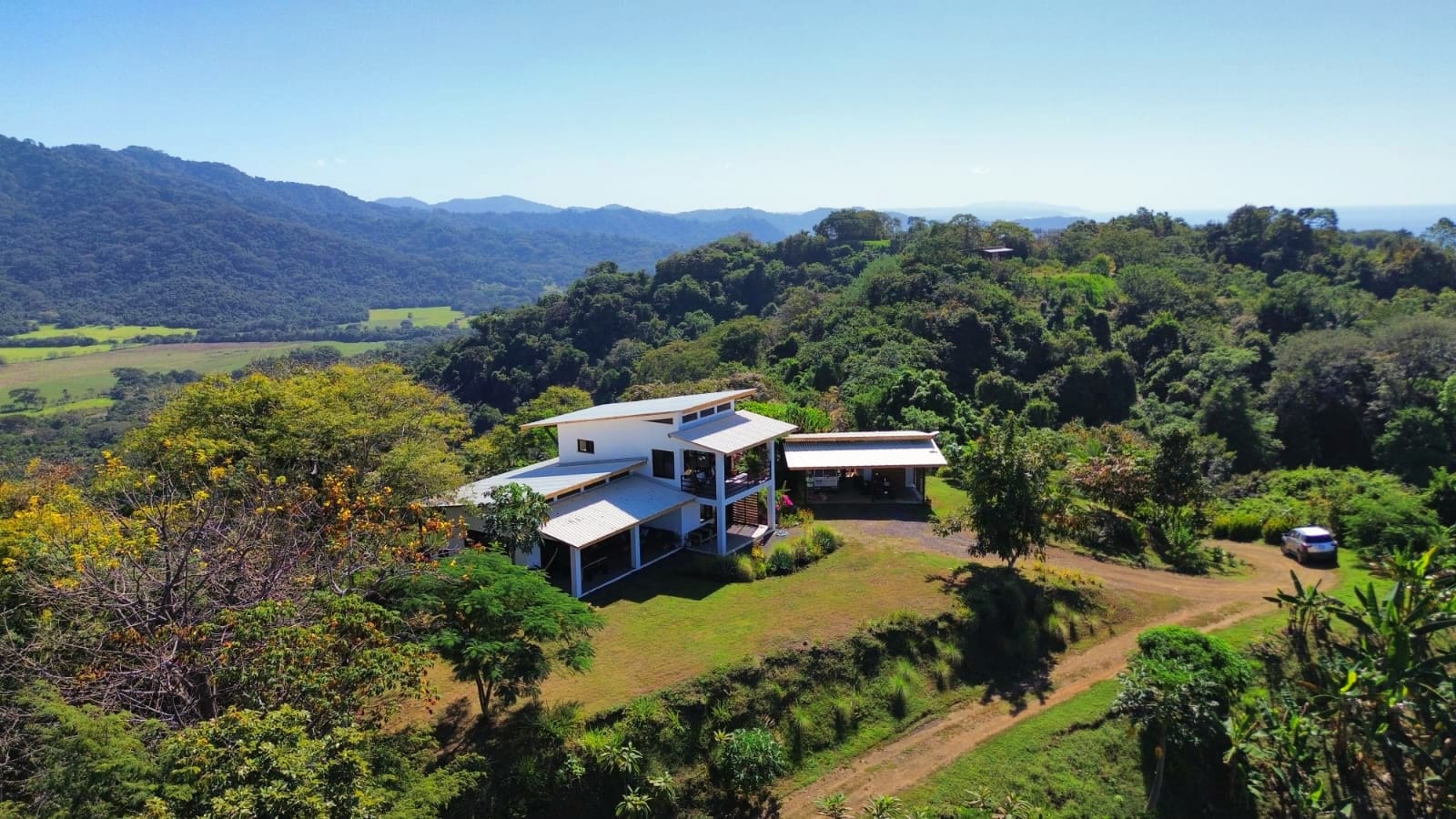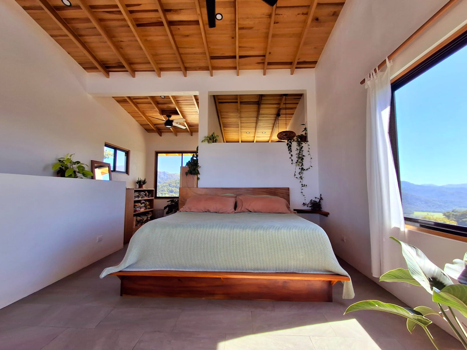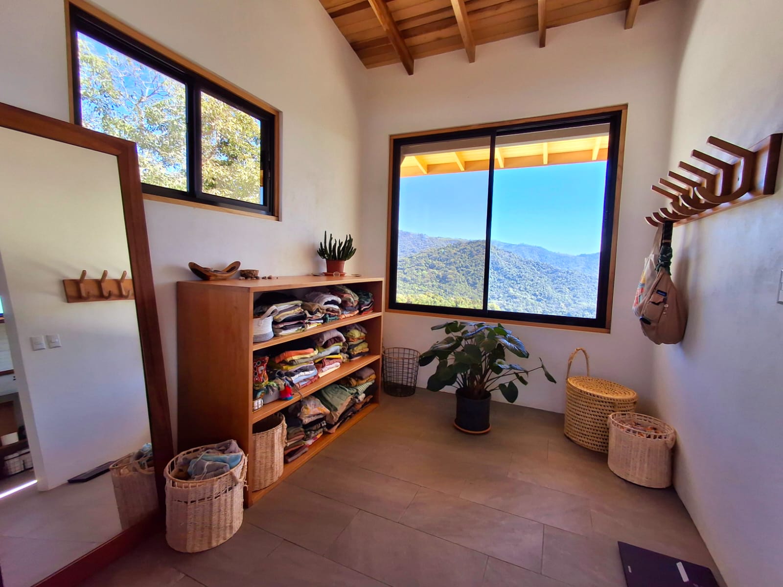 Set on top of a hill, the home enjoys uninterrupted 360-degree views. Sunrise and sunset, mountains, jungle, valley, and ocean—every direction offers something special. Thanks to its elevated position, a refreshing breeze flows through the house most of the time, enhanced by the open-concept design and large windows on both sides: mountains behind and wide-open ocean views in front.