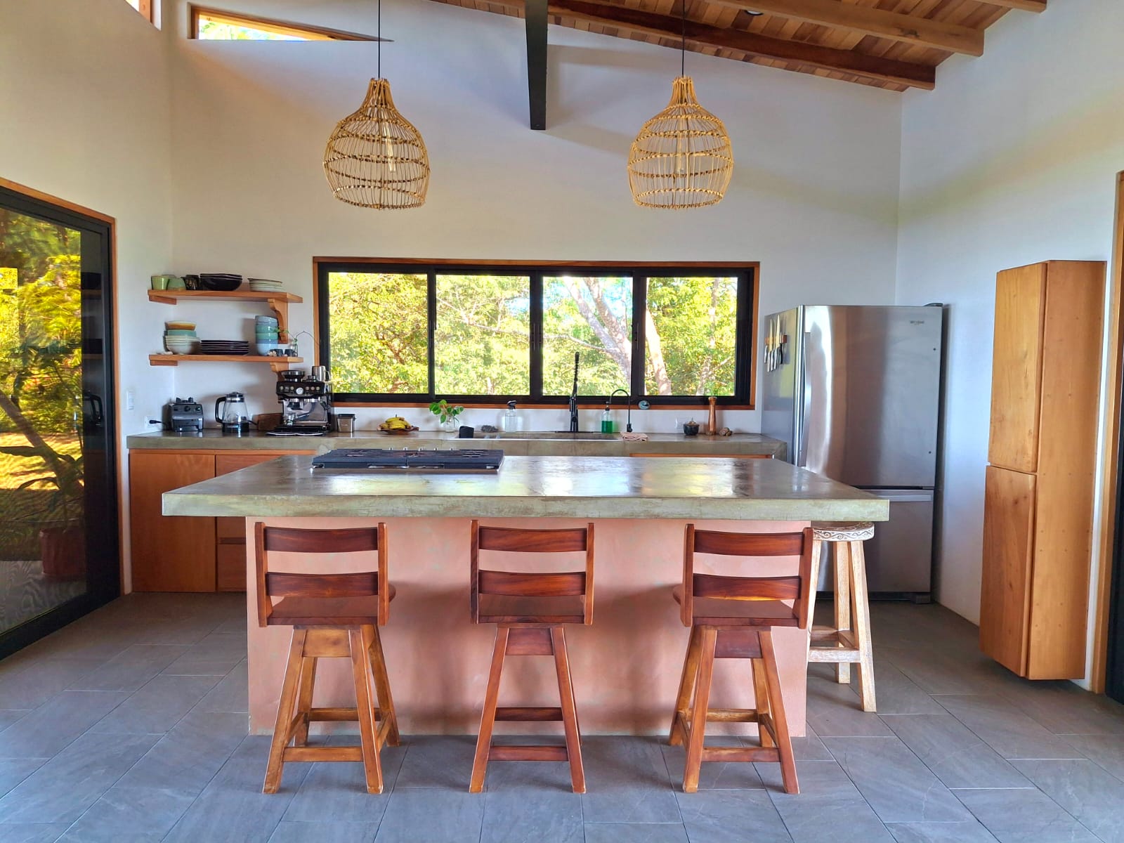 The interior is bright and inviting, with high ceilings finished in warm teak wood that add character and a welcoming feel. The kitchen features a beautiful design with a large island, opening into a comfortable and tastefully furnished living area that immediately feels like home.