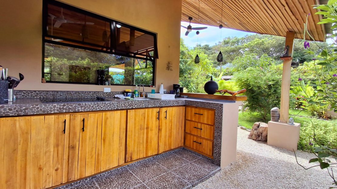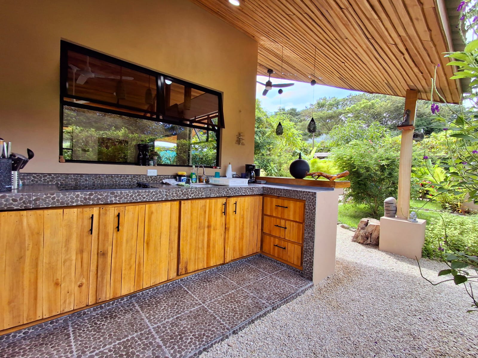 Inside, the house feels bright and airy, with an open-concept living area and a charming outdoor kitchen under a covered terrace that creates a real tropical vibe while cooking or entertaining. Both bedrooms come with air conditioning, and the home features teak ceilings throughout, inside and out, adding warmth and character.