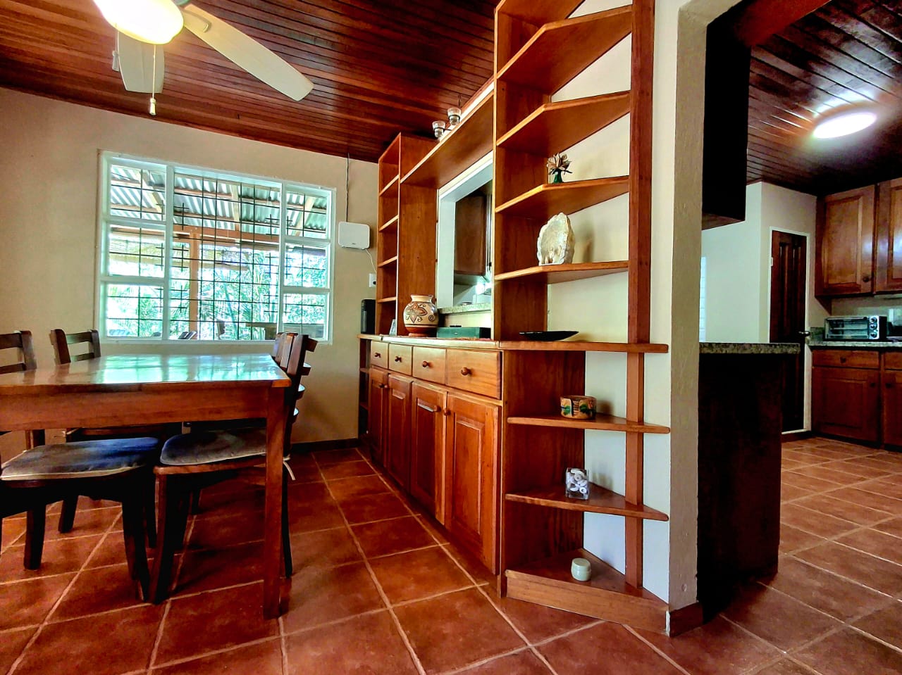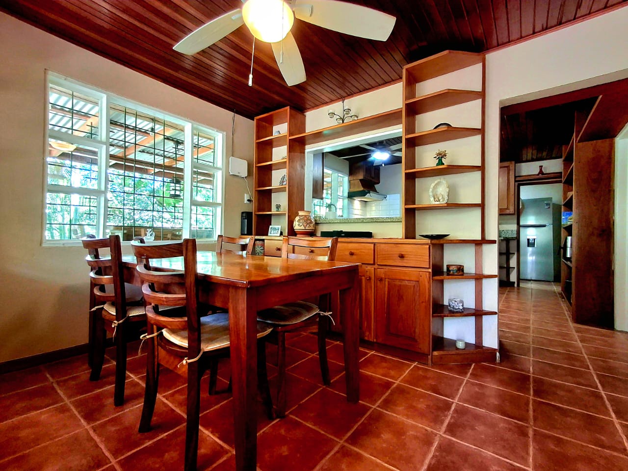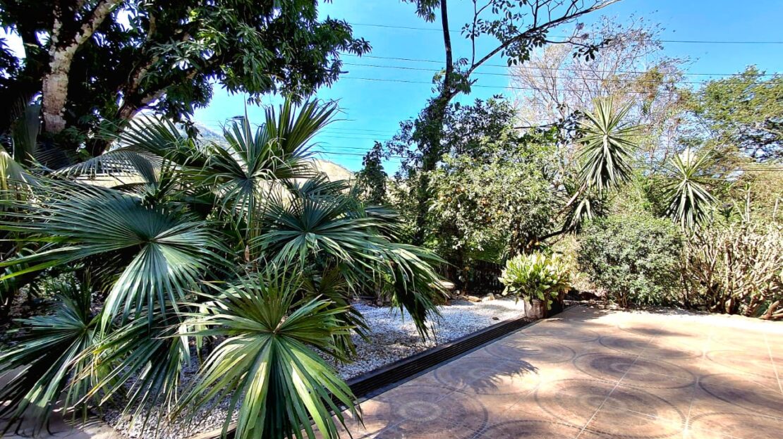 Inside, the home offers a comfortable and practical layout. The dining area connects directly to the kitchen through an open pass-through, and the spacious, fully equipped kitchen enjoys a beautiful view of the surrounding greenery. Two guest bedrooms are located on the right side of the house and share a bathroom. At the back of the home, the master bedroom offers privacy, an ensuite bathroom, and direct access to a terrace through large windows or a private door.