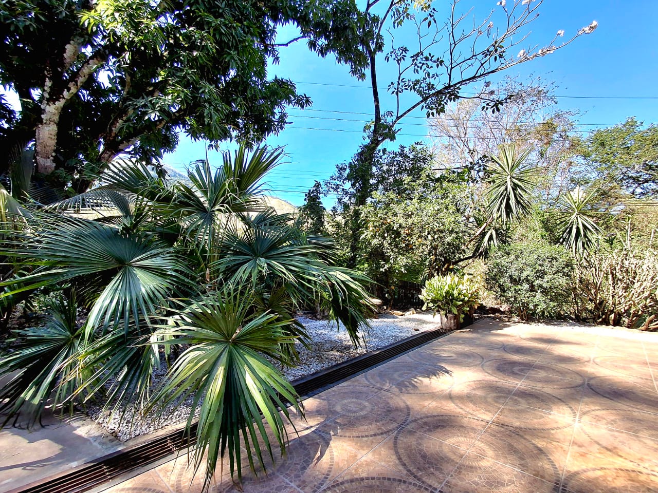 Several tall trees provide natural shade and create a relaxing, green environment that gives the property a warm and tranquil feeling. The entrance features a large electric gate and parking space for two to three vehicles. A lovely covered terrace runs along the front and side of the house, and along the side terrace you will find a large wooden dining table, a comfortable sitting area, and plenty of space to hang out and enjoy a proper BBQ with family and friends.