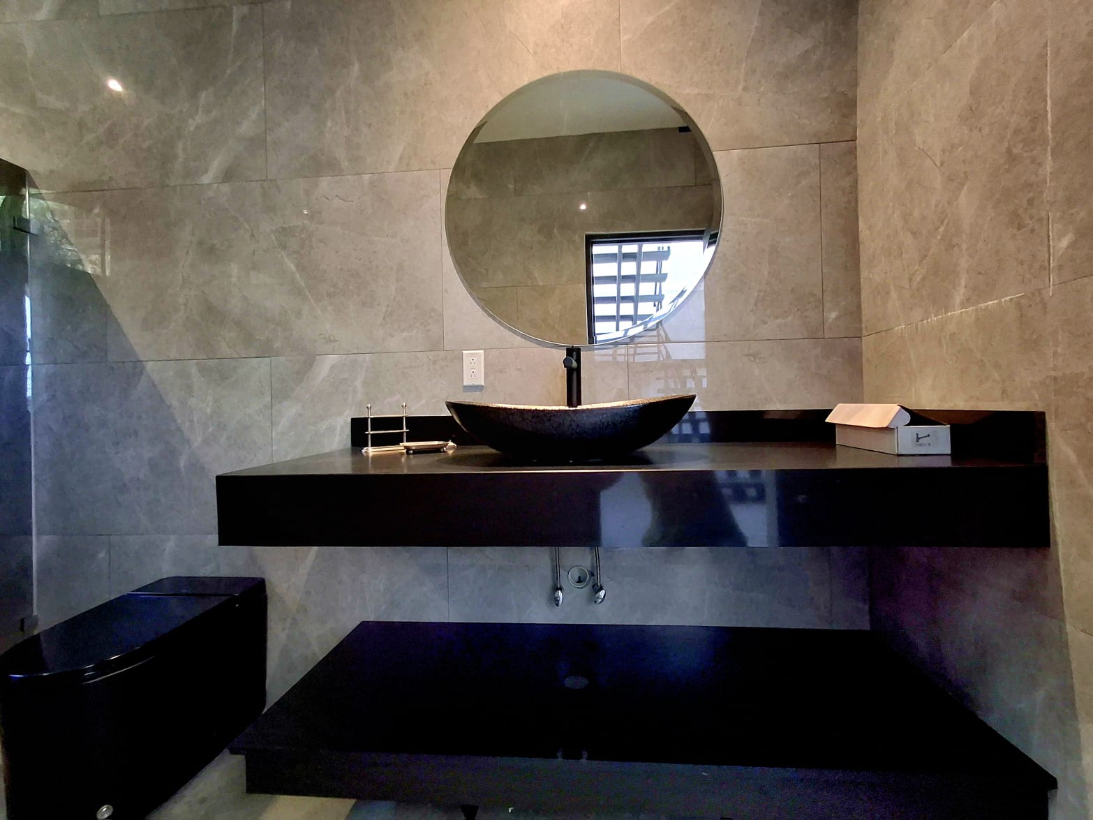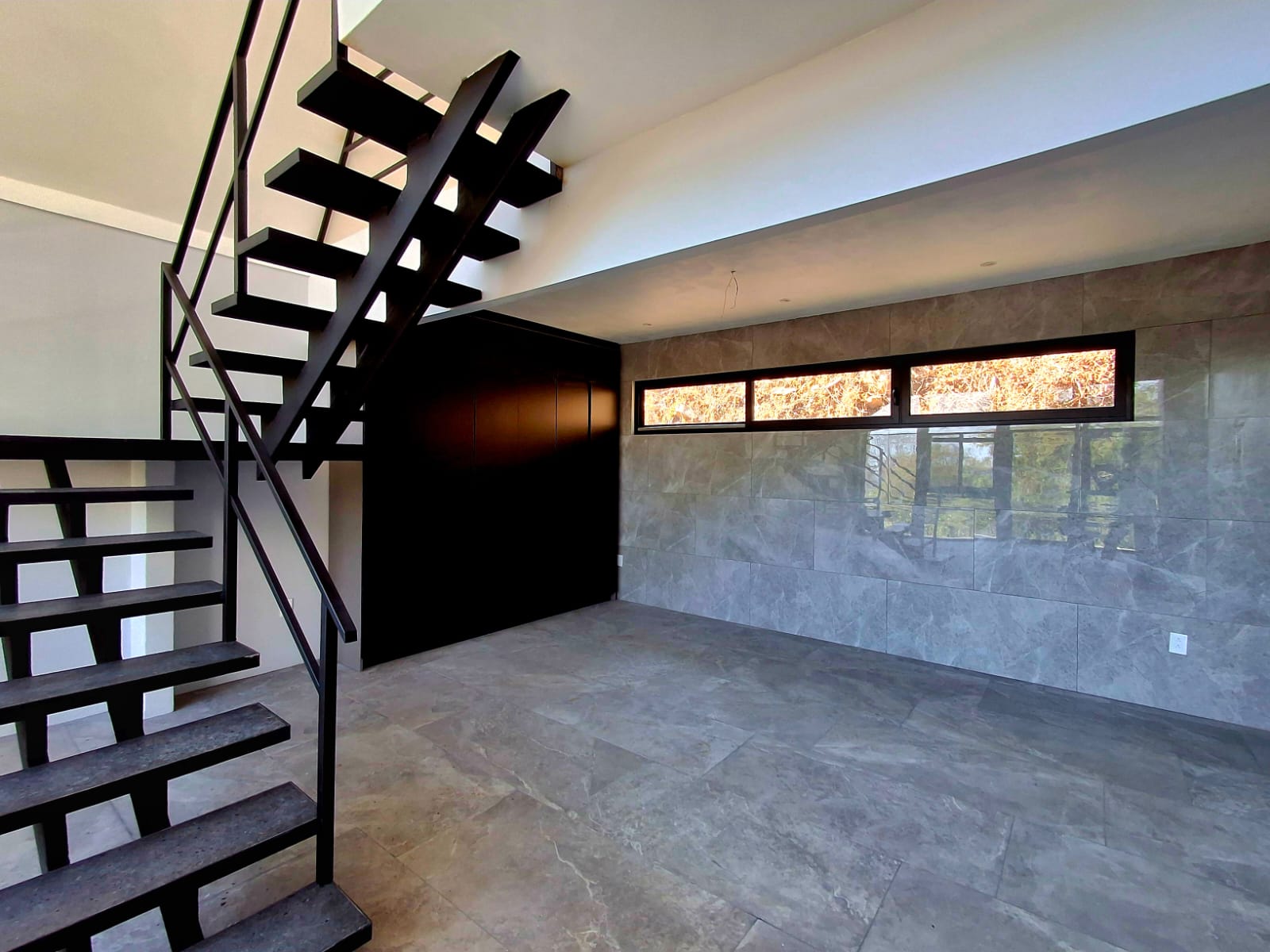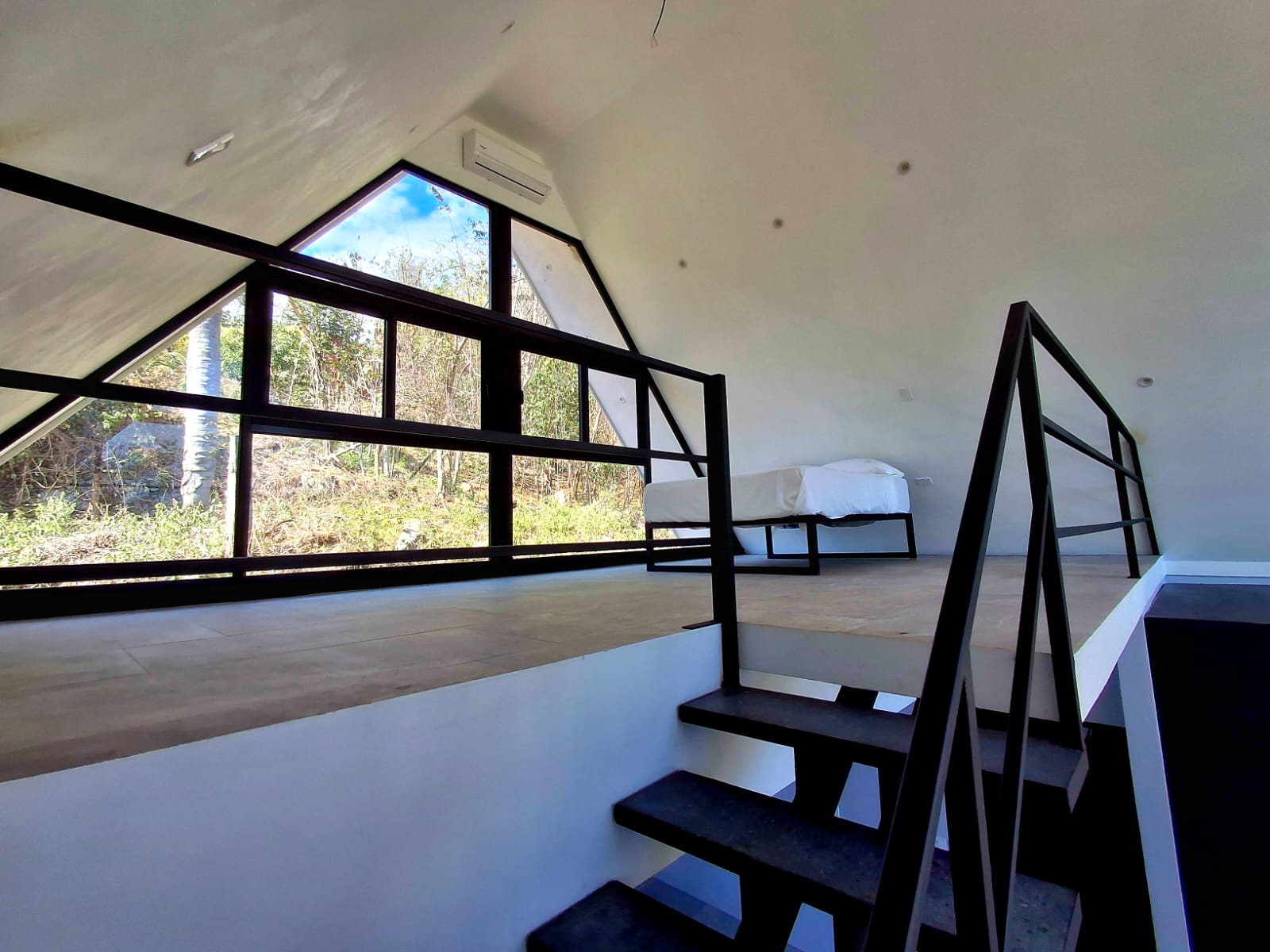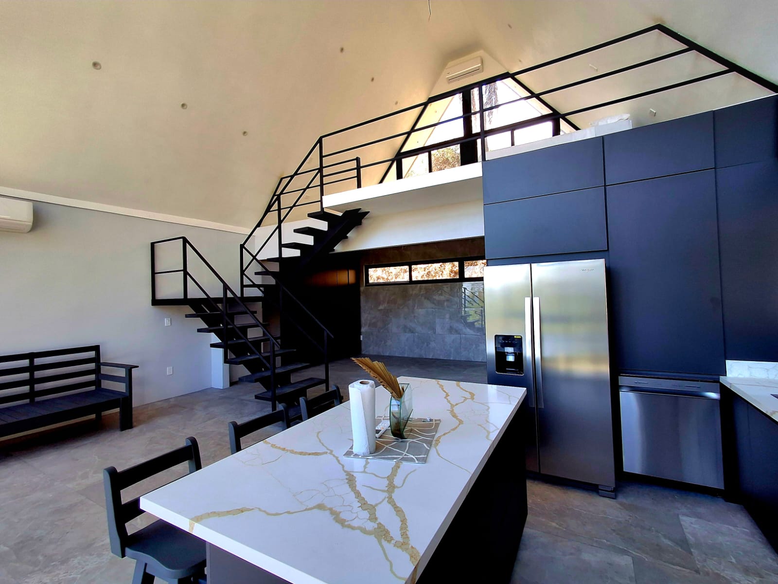 On the main floor, you will find a beautiful bathroom with a modern black design, as well as a spacious open area with a large built-in closet — perfect for creating a comfortable living room or additional relaxation space. A staircase leads to a stunning mezzanine level, which serves as bedroom and gives the home a very airy and contemporary feel.