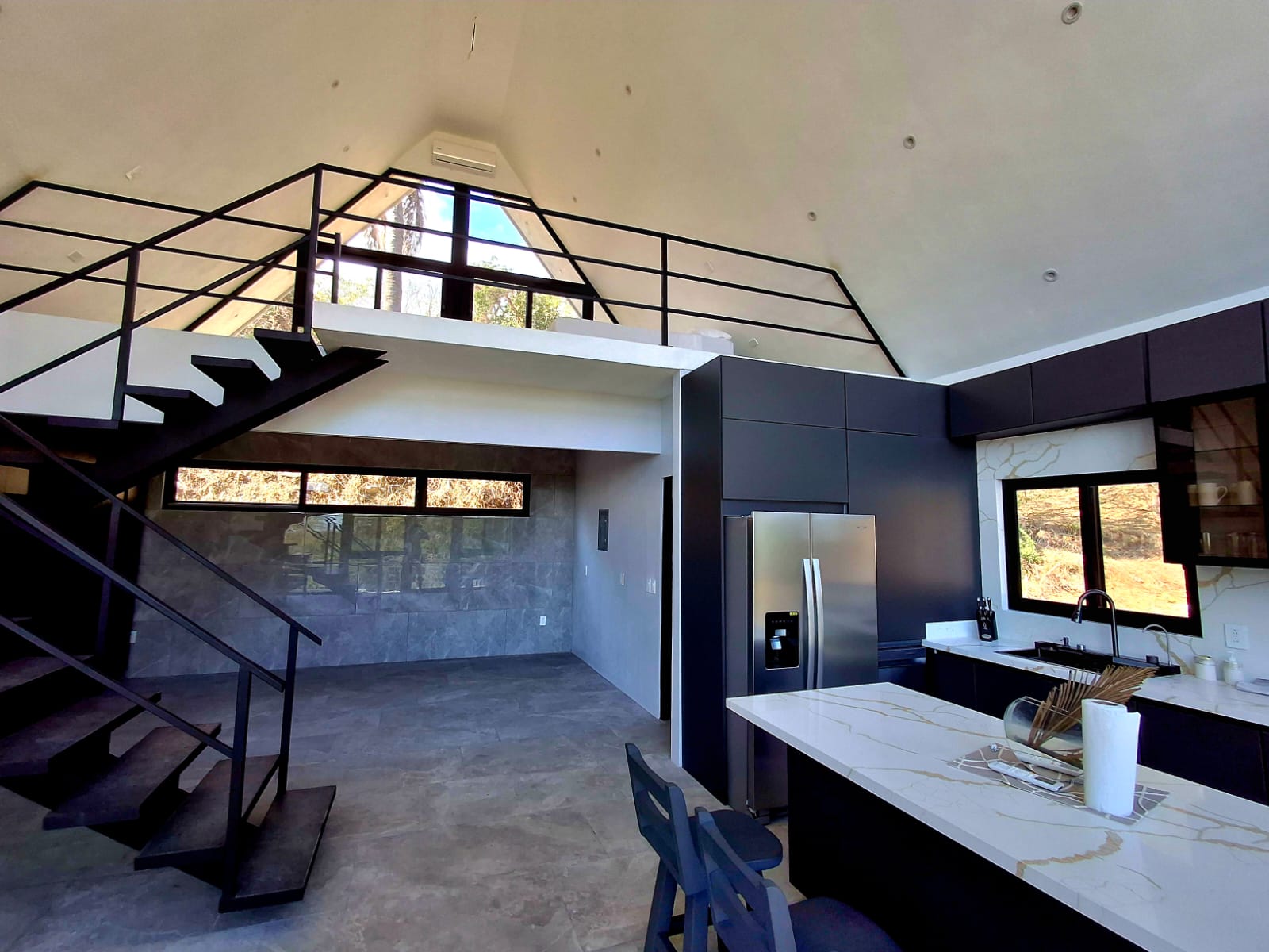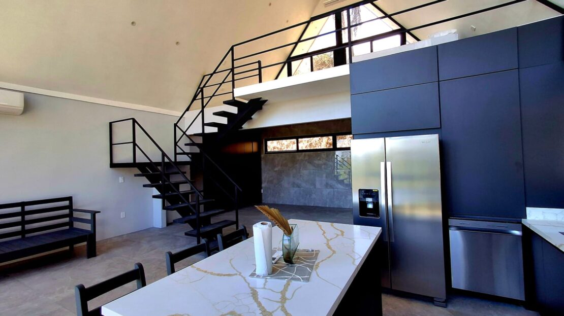 The property features two identical homes-built side by side (each measuring 92 m2/1,000 sqft), both with a modern triangular design and a very open and bright layout. As you enter the home, you are welcomed by a stylish, fully equipped kitchen with a dishwasher and a large refrigerator. The kitchen also cleverly hides a washer and dryer behind custom cabinetry, keeping the space clean and functional.