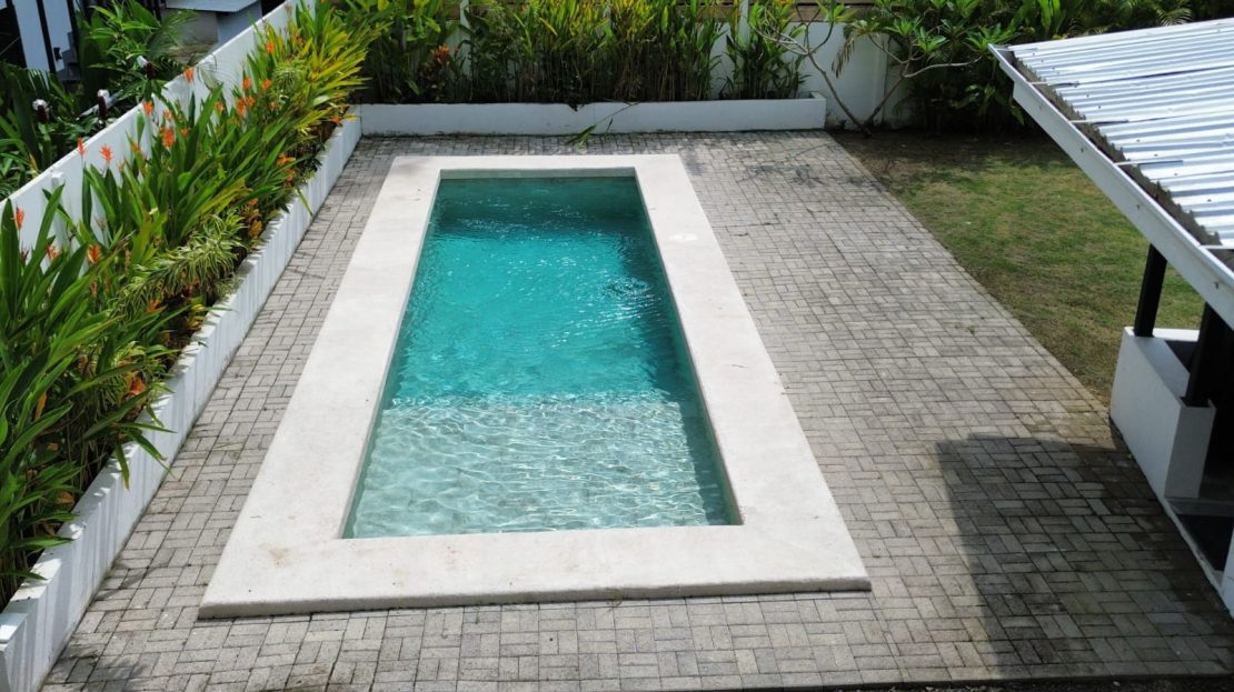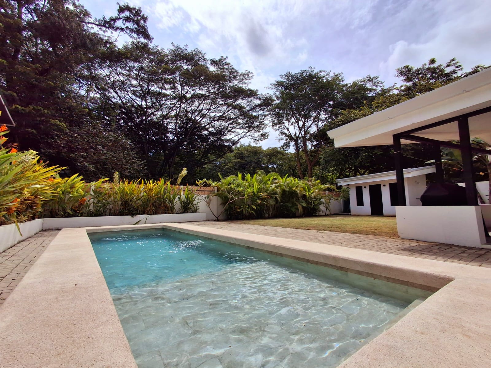 The backyard features a long, refreshing swimming pool, ideal for cooling off on warm days, with plenty of shade under the terrace. The property is fully fenced, includes a parking space, and is surrounded by mature trees, keeping the neighborhood beautifully green and peaceful.